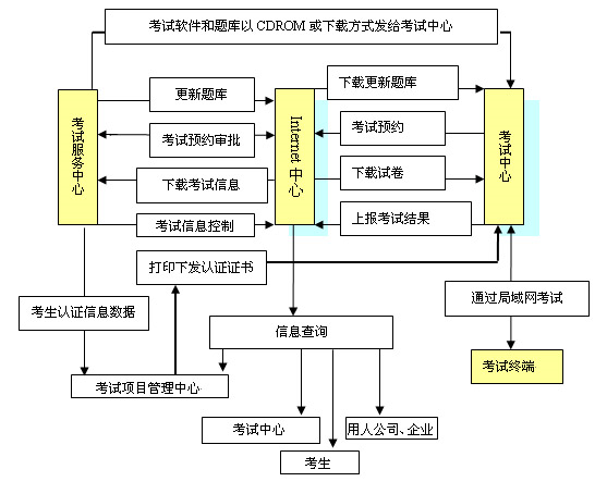 学生通过测试系统或测试管理网站报名,测试中心通过Internet中心申请组卷授权。