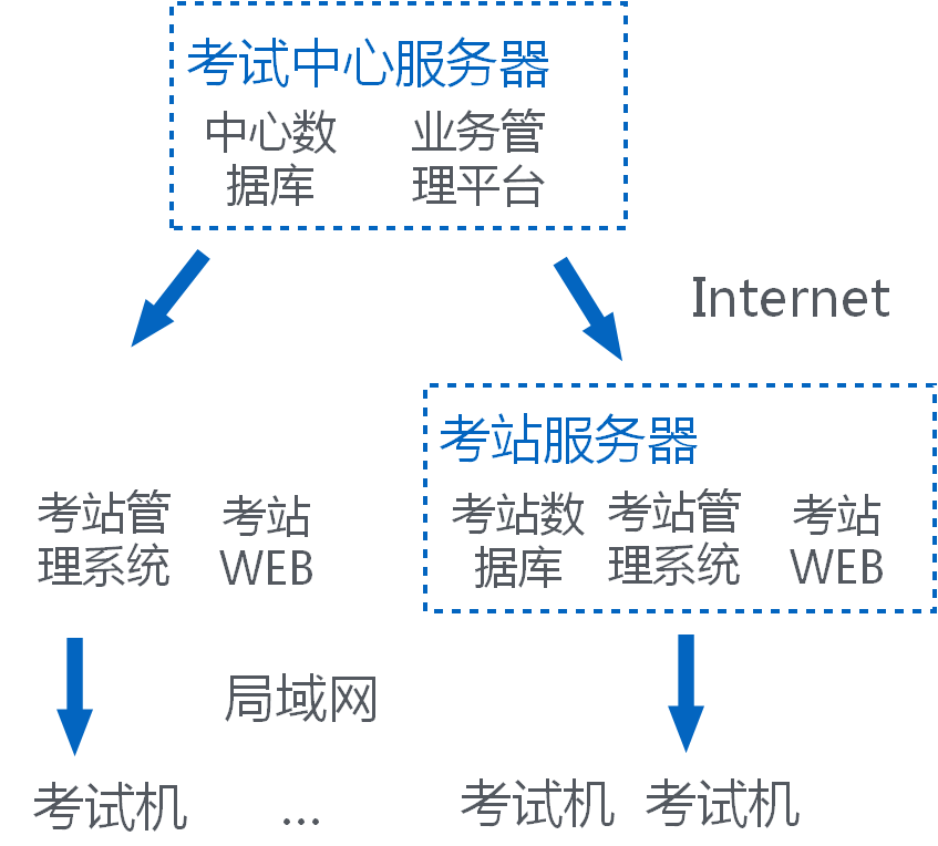 只部署测试站服务器,通过测试站管理系统,导入题库、组卷策略等参数完成局域网测试。